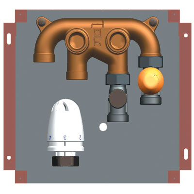 Комбинирано за вертикална монтажа. Комплетот се состои од ѕидна кутија со бел капак, RL-1 вентил за запирање, граничник на повратна температура MINI, термостатски вентил TS-98-V како и разделник со двоен приклучок