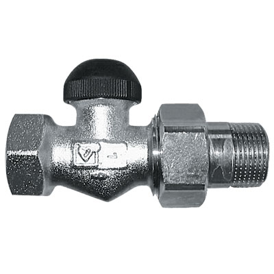 Durchgangsform, vernickelte Ausführung mit schwarzer Schraubkappe. Universalmodell mit Spezialmuffe für Gewinderohr und Klemmsetanschluss. Am Oberteil ist ein schwarzer Markierungspunkt angebracht.