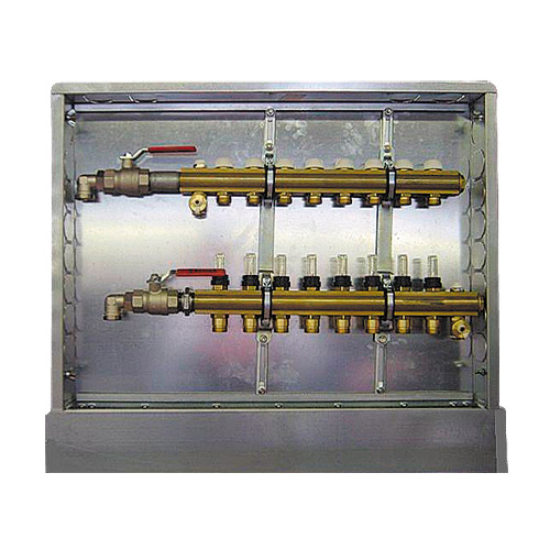 • Разделник со топметри од бронза, собирник на горните делови од термостат, со славина за полнење празнење, воздушни вентили, крајни капи и носачи. Излезни разделници и собирник не се еден под друг туку поместени
