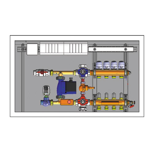 Разделник со топметри, собирник со термостатски вентили, испуштање на воздух, празнење со помош на приклучок за црево, држачи за разделник, термомотори за регулирање на греен круг, механичка регулација на температура, вентил на заклучување, циркулациона пумпа, автоматска заштита од превисоки температури со исклучување на пумпата, регулирање на диференцијален притисок со преструен вентил, фабрички монтирано во разделно шкафче од поцинкуван бронзен лим, рамка и врата со бела боја (RAL 9010). Вградена длабочина променлива (80–110 mm), висина 705–775 mm, носачите на цевки може да се тргнат.