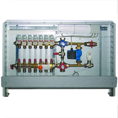 Разделник со топметри, собирник со термостатски вентили, испуштање на воздух, празнење со помош на приклучок за црево, држачи за разделник, термомотори за регулирање на греен круг, механичка регулација на температура, вентил на заклучување, циркулациона пумпа, автоматска заштита од превисоки температури со исклучување на пумпата, регулирање на диференцијален притисок со преструен вентил, фабрички монтирано во разделно шкафче од поцинкуван бронзен лим, рамка и врата со бела боја (RAL 9010). Вградена длабочина променлива (80–110 mm), висина 705–775 mm, носачите на цевки може да се тргнат.