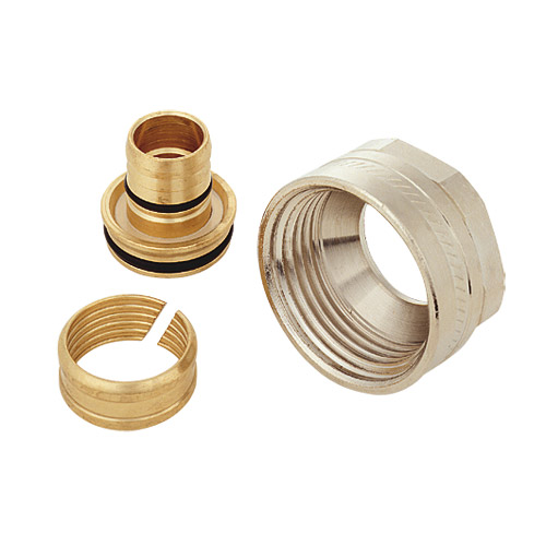 Za PE-X, PB- и алуминиумски спојни цевки. Се состои од чатали за цевка, прстен за стегање и навртки G 1 со конус.