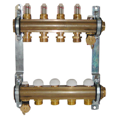 Разделник за подно греење, комплет со топметри, димензија 1, се состои од разделник со топметри, собирник со горни делови на термостат, воздушни вентили, славина за полнење и празнење, завршни капи и носачи. Излезите на разделникот и собирник не се еден под друг туку поместени. Разделник со внатрешен навој Rp 1, цевест приклучок G 3/4. 6 l/min топметри.